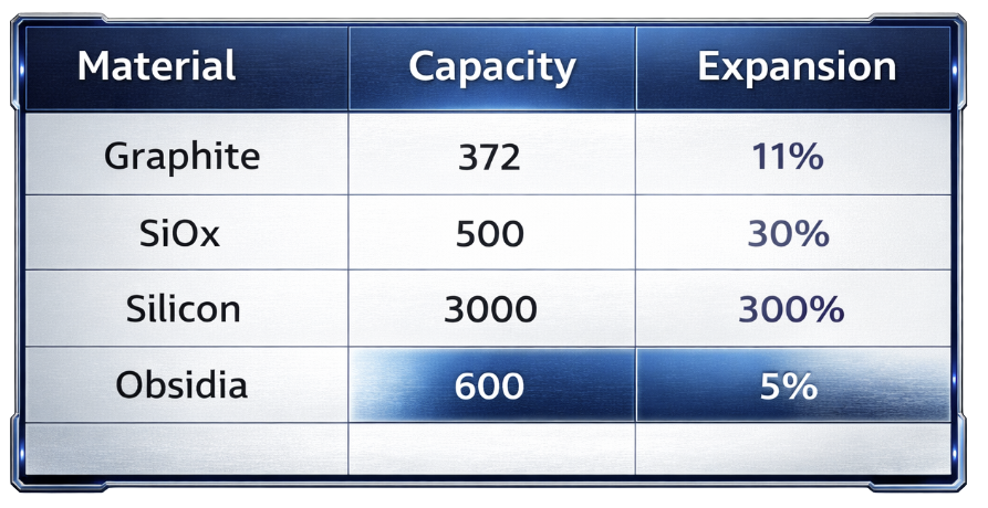 Obsidia inherently has less swelling than other silicon anode materials without the need for extensive nanoengineering, enabling long cycle life without astronomical costs.